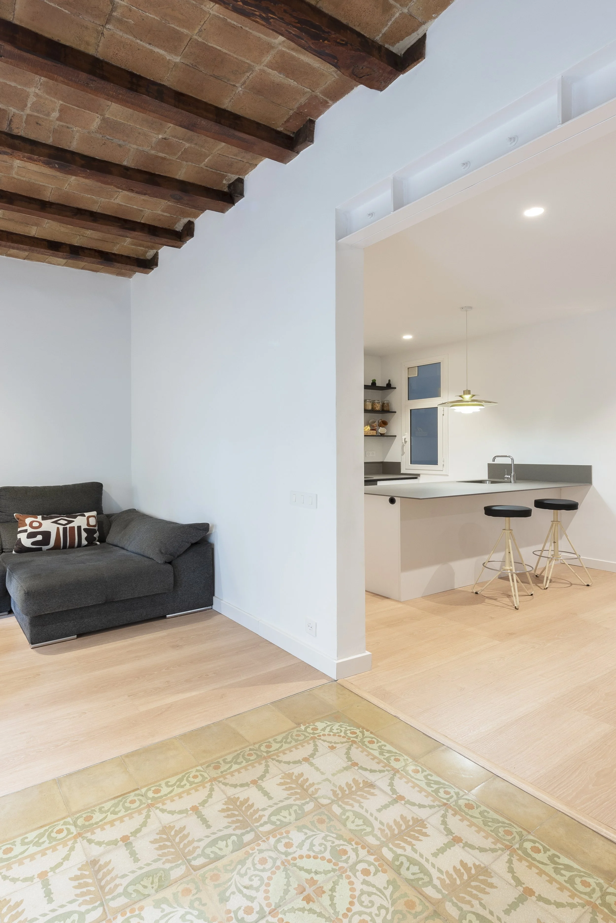 En este clásico piso del Eixample de Barcelona, la intervención más importante fue la redistribución de las zonas de noche y de día, haciendo de la de día el núcleo de la vivienda. El salón, cocina y comedor son ahora espacios diferenciados pero perfectamente conectados, ¡ideal para un propietario al que le encanta organizar cenas y veladas! En esta área recuperamos los techos de bóveda catalana y una zona de suelos hidráulicos, dos elementos clásicos de la arquitectura del Eixample que le otorgan personalidad.